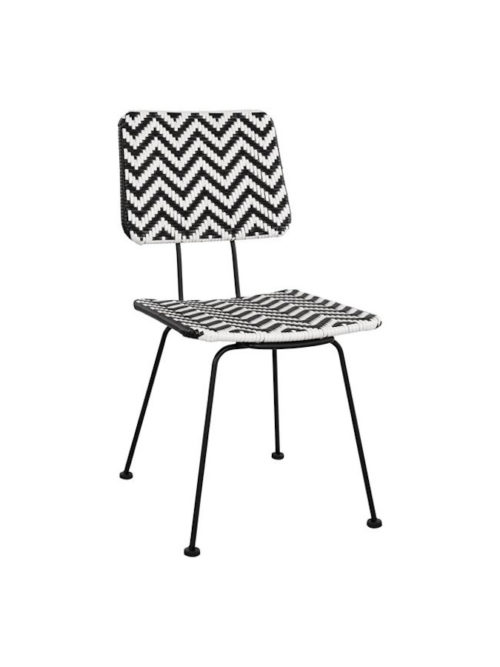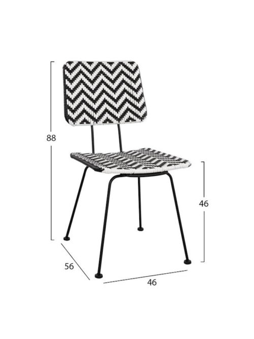 Μοντέρνα καρέκλα εξωτερικού, αλλά και εσωτερικού χώρου, κατασκευασμένη από μεταλλικό σκελετό σε μαύρη απόχρωση και επενδυμένη με πλεκτό wicker σε λευκό & μαύρο chevron. Το wicker έχει μεγάλη ανθεκτικότητα σε υψηλές και χαμηλές θερμοκρασίες από (-85c έως +85c.), ακόμα είναι εμπλουτισμένο με σταθεροποιητή UV για τις ακτίνες του Ήλιου. Ιδανική για χώρους εστίασης αλλά και για το σπίτι σας, θα σας χαρίσει άνεση και ξεκούραση. Διαστάσεις: 46x56x88Υ εκ. Ύψος καθίσματος: 46 εκ. Διαστάσεις καθίσματος: 46x42 εκ. -