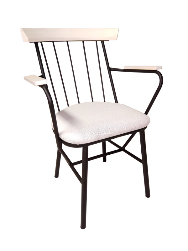 Πολυθρόνα μεταλλική με ξύλο στη πλάτη και επένδυση από ύφασμα ή δερματίνη.