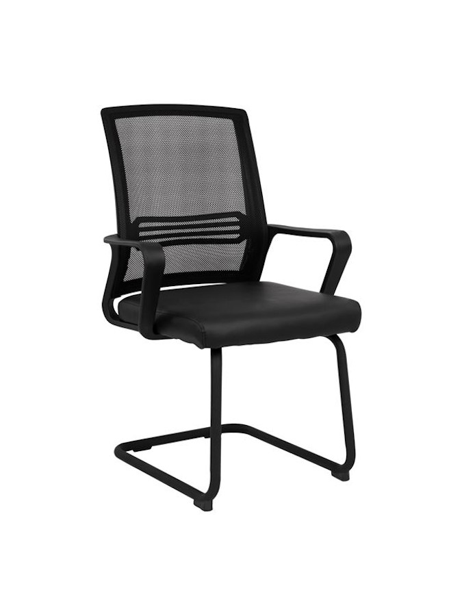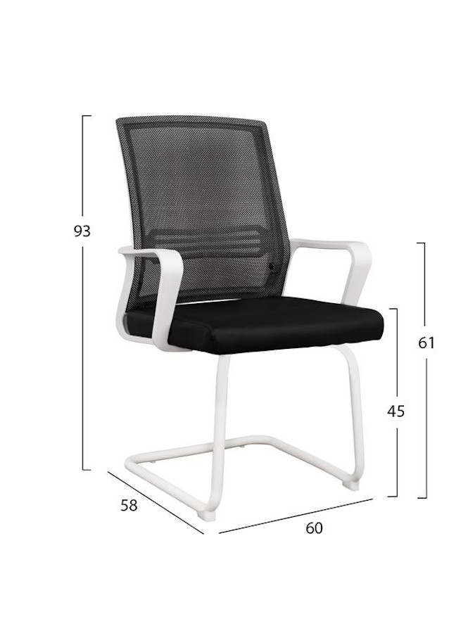 Καρέκλα επισκέπτη, άνετη και αναπαυτική, με μπράτσα πολυπροπυλενίου σε μαύρη απόχρωση και πλάτη με διάτρητο μαύρο ύφασμα mesh που την αφήνει να αναπνέει και να μην ιδρώνει.