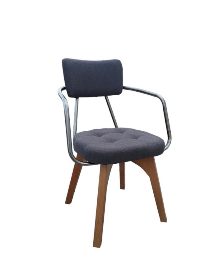 Καρέκλα-πολυθρόνα με ξύλινα πόδια και μεταλλικό σκελετό στα μπράτσα και στην πλάτη. Κάθισμα επενδυμένο με ύφασμα.