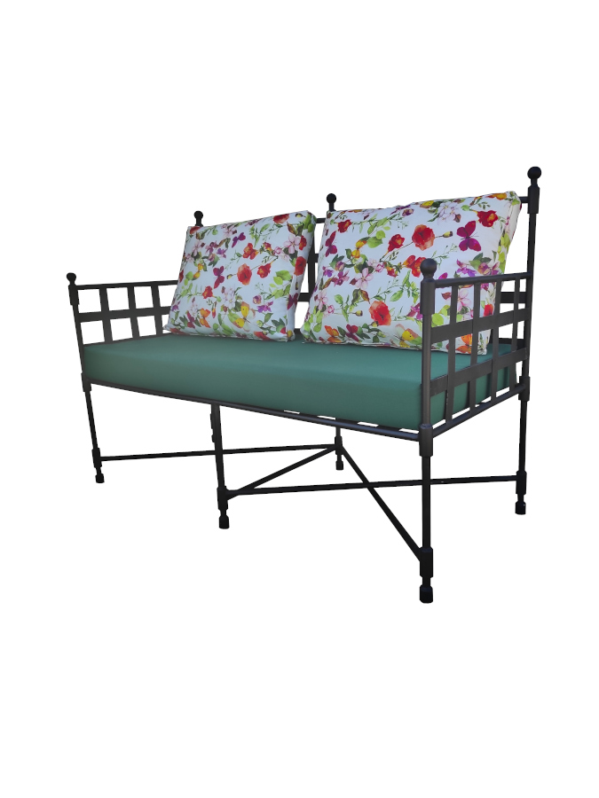 Καναπές με μεταλλικό σκελετό και αποσπώμενα μαξιλάρια με ύφασμα.