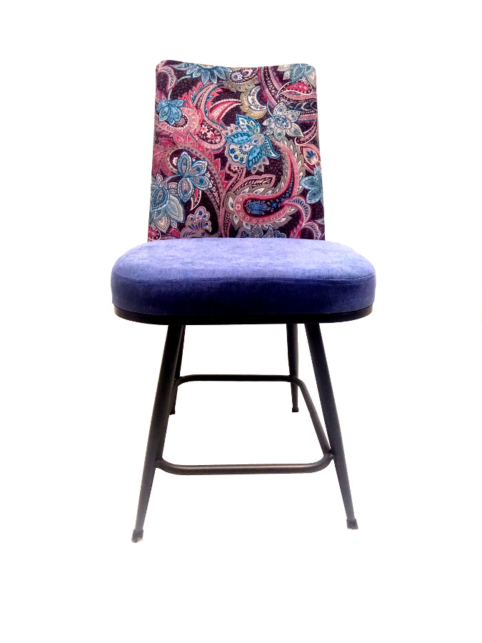 Καρέκλα με μεταλλικό σκελετό και επενδυμένη με ύφασμα.