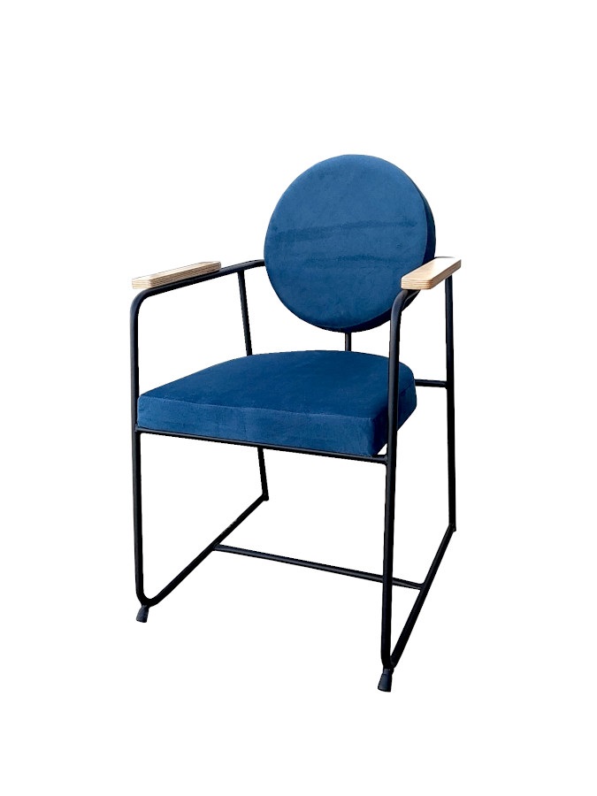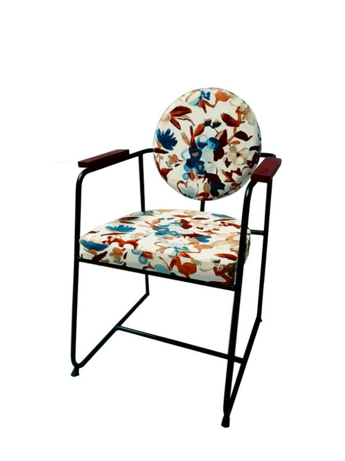 Πολυθρόνα με μεταλλικό σκελετό και ξύλινα στοιχεία στα μπράτσα. Το κάθισμα και η πλάτη είναι επενδυμένα με ύφασμα.