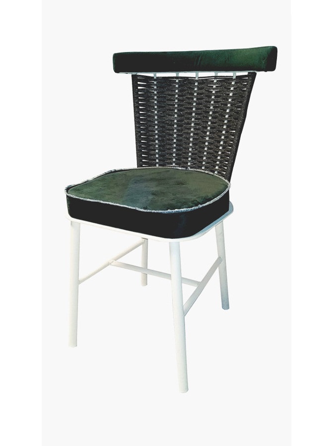 Μεταλλική καρέκλα με ύφασμα και πλέξιμο στην πλάτη.