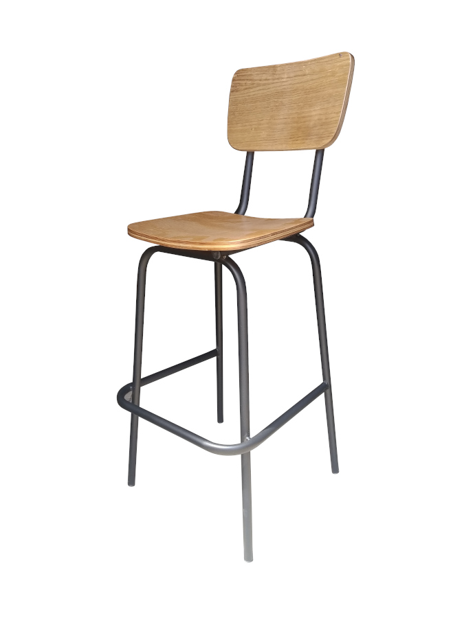 Σκαμπό με μεταλλικό σκελετό με κάθισμα και πλάτη από ξύλο κόντρα πλακέ.