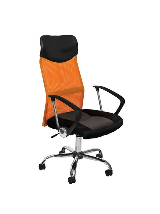 Καρέκλα γραφείου με μπράτσα από μαύρη πολυκαρβονική επιφάνεια, με ψηλή πλάτη και διάτρητο ύφασμα.