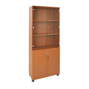 Βιβλιοθήκη γραφείου επαγγελματική από μελαμίνη με δύο γυάλινες πόρτες στο επάνω μέρος και δύο κάτω πόρτες με κλειδαριά.