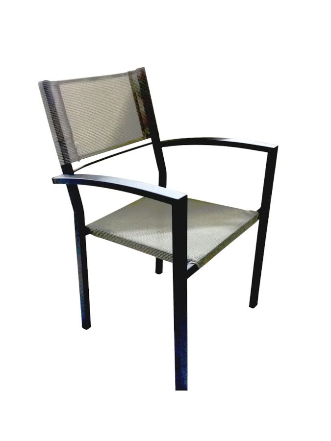 Μεταλλική πολυθρόνα εξωτερικού χώρου με διάτρητο πανί στο κάθισμα και στην πλάτη.