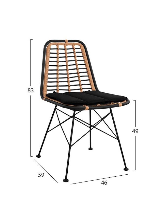 Μοντέρνα καρέκλα εξωτερικού, αλλά και εσωτερικού χώρου, κατασκευασμένη από μεταλλικό σκελετό σε μαύρη απόχρωση και επενδυμένη με πλεκτό wicker σε μπεζ απόχρωση.